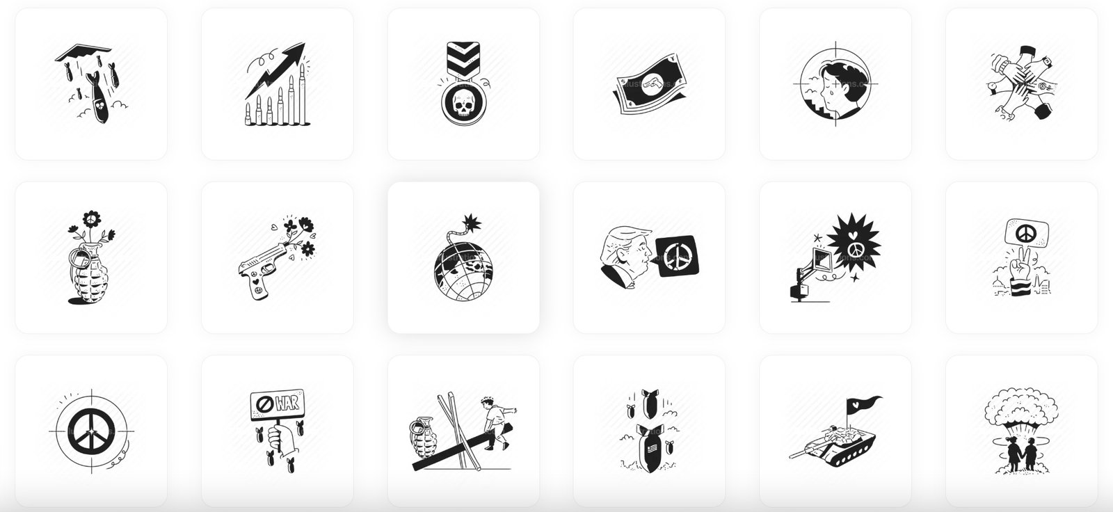 The themes of peace, anti war, unity, and nonviolence are the focal points of 25 strong and provocative pieces of art in this free vector illustration pack. Each scene, which is hand-drawn in a simple black and white style, visually convert the message of international harmony, resistance to violence, and the value of diplomacy in the modern world. Through expressive visual storytelling, this collection seeks to spark discussions and raise awareness. It includes images of war protests, peace symbols, broken weapons, and hopeful gestures, as well as thought pieces on war profiteering and its effects. These illustrations are made to emotionally connect and have an impact, whether you’re creating instructional materials, protest imagery, editorial pieces, or humanitarian campaigns.