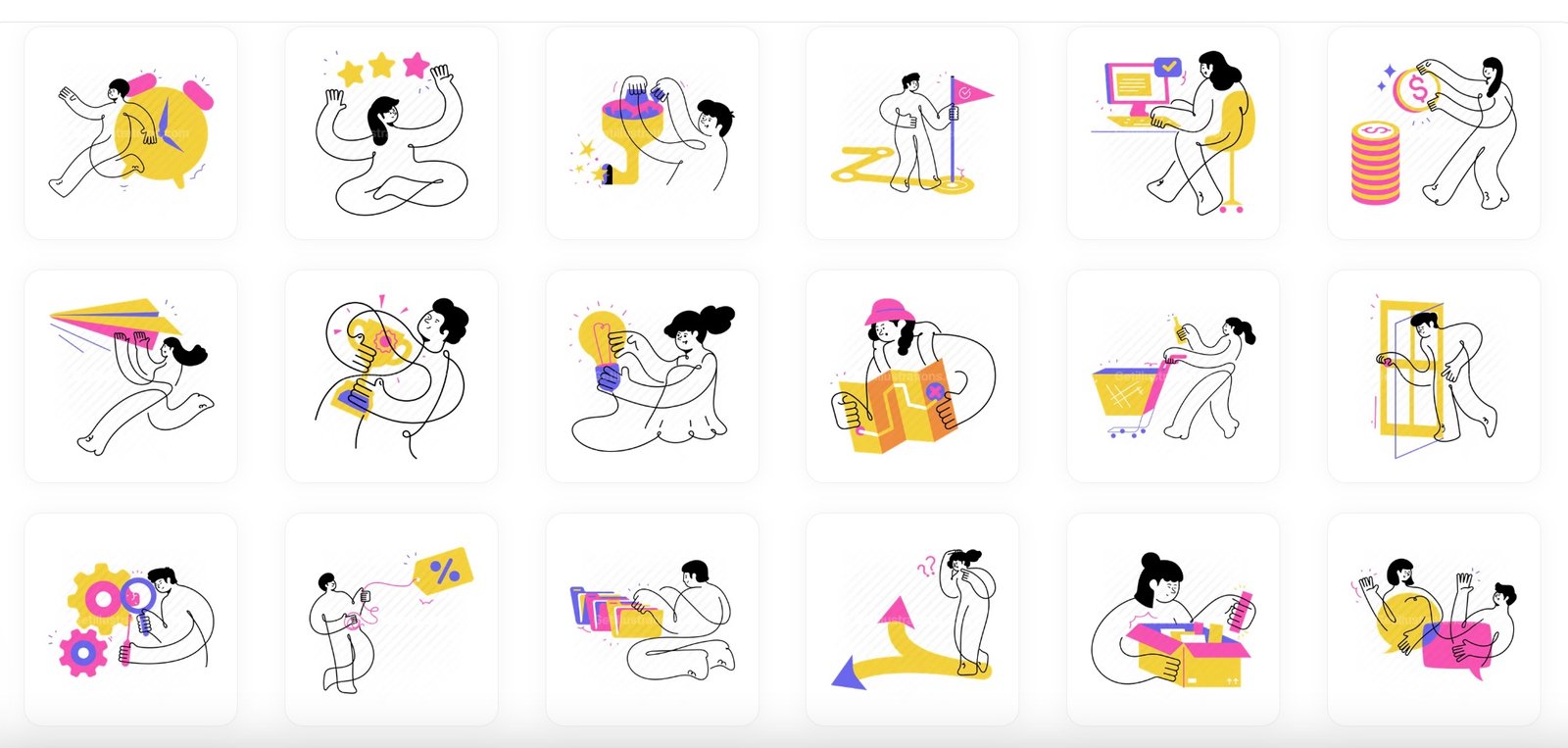 Noodle Illustrations are designed to add whimsical charm and originality to your projects. These whimsical illustrations, which are made with a single continuous line and enhanced with vibrant shapes, add a little something unique and more approachable to any design. Because Noodle Illustrations strikes a balance between simplicity and whimsy, it’s ideal for product design, teamwork visuals, and imaginative storytelling.